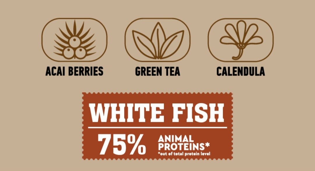 Composition: white fish 45 % (dried and finely ground), potato flakes, peas, poultry fat, sugar beet pulp, salmon oil (1 %), linseed, fructooligosaccharides (FOS), yucca extract, acai berries (0,1 %), green tea (0,05 %), marigold dried (0,02 %).