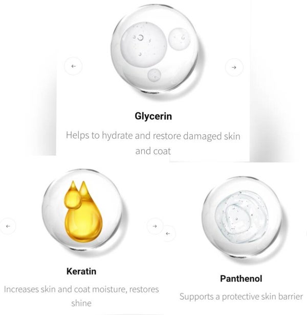 The product contains panthenol. It is a form of vitamin B5 widely used as an ingredient in both skin and hair care products. It makes the coat easy to comb, soft, and gives it a healthy shine.