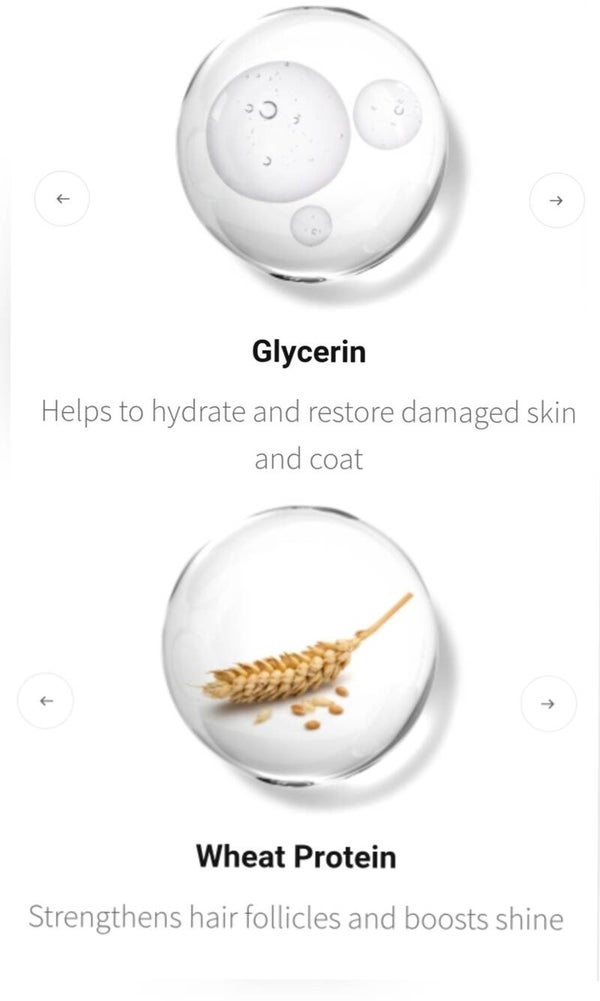 - Wheat proteins - restore the coat, provide moisture, and moisturize the skin.
