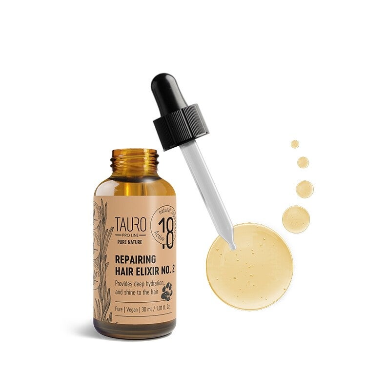 Tauro Pro Line Pure Nature Repairing Elixir No. 2 is a combination of natural oils and essential oils, enriched with vitamins and amino acids, effectively moisturises and aids in the restoration of damaged and lack-luster fur and skin. With eight natural oils and ten premium essential oils, this product provides exceptional moisturisation for pets' coats and skin. It effectively restores damaged hair quality and improves the coat's structure while soothing, softening, and protecting both the coat and the skin against adverse environmental factors. The elixir is particularly well-suited for pets with problematic skin and coarse, tangled coats.