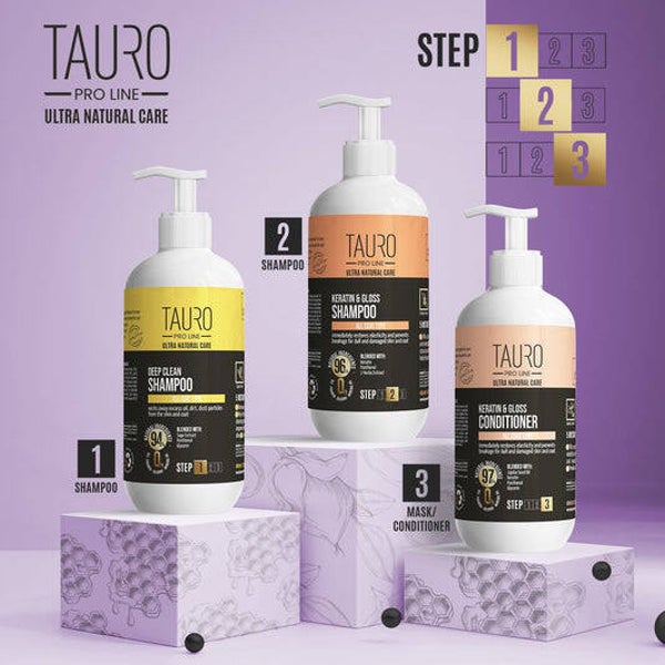 The Tauro Pro Line Keratin Care Set is a 3-step professional system designed to deeply cleanse, nourish, and restore the natural strength and shine of the coat and hair. Formulated with high-quality natural ingredients, this system ensures long-lasting smoothness and vitality while being gentle on the skin and scalp.