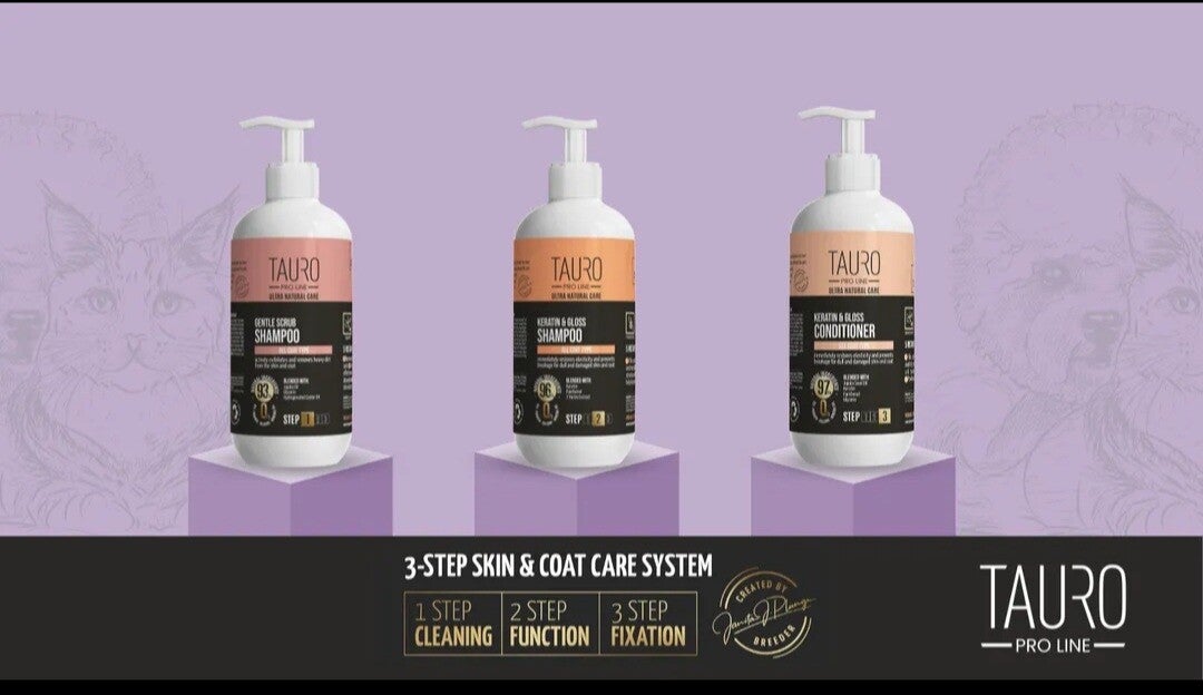 The first step in the Tauro Pro Line system is a natural deep-cleansing scrub shampoo.