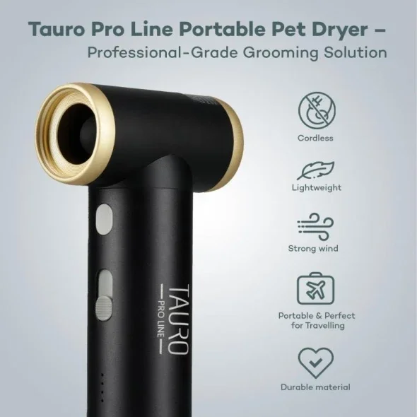 Introducing the Tauro Pro Line Professional Pet Grooming mini dryer – engineered to provide efficient and comfortable drying for your pet's grooming sessions. Featuring a cordless design, lightweight construction, and super-strong wind power, it offers unmatched convenience and performance for both home and professional grooming. Crafted for durability, this fan ensures exceptional results every time.
