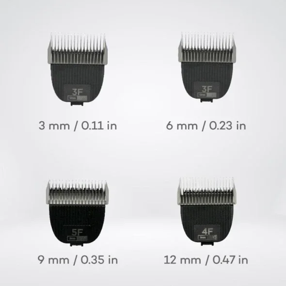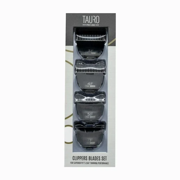 Tauro Pro Line Stainless Steel Interchangeable Head set for the Tauro Pro Line 909. The set includes four different heads with varying cutting lengths: 3 mm, 6 mm, 9 mm and 12 mm which allows you to choose the appropriate size for grooming different areas of your pet's body. This gives you an even better trimming result. Crafted from the highest quality 440c stainless steel, these heads offer exceptional durability and longevity. In addition, thanks to the quality materials used, the heads won't wear out quickly and the blades won't fall apart. The blades are also precisely molded to be as sharp as possible without causing harm to your pet.