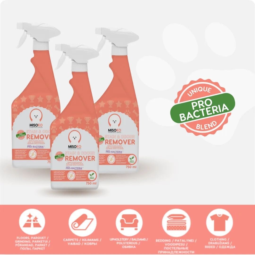 Probably every dog owner has encountered a problem of unpleasant smell and stains. MISOKO is an effective spray to remove odours and stains that perfectly eliminates odours and helps to clean even the most problematic stains.