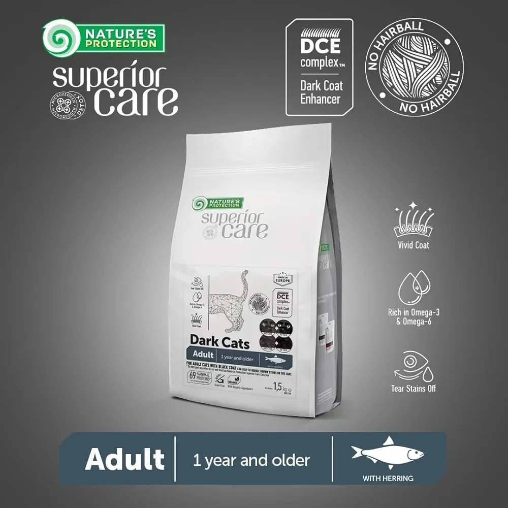 Nature’s Protection Superior Care Dark Cats Grain Free with Herring for Adult All Breeds is known for its well-balanced composition and raw materials, which help to fight against brown tears stains and to keep healthy skin and coat. The main source of protein in this complete dry cat food is herring. It is hypoallergenic, easily digestible, perfect for weight control, and a great source of vitamin D, B₁₂, E, and minerals. It also contains organic marigold and green tea extract for vision and antioxidant support. The complete and balanced composition of this dry cat food is enriched with clinoptilolite of volcanic origin from nature – MicroZeoGen, which helps to remove toxins and improve nutrient absorption. It is also fortifield with superior sources of Omega-3 fatty acids that could help to maintain the intensive colour of the coat and the perfect condition of the skin.