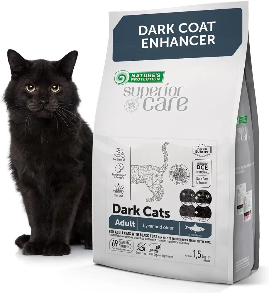 Dry grain free pet food with herring for adult all breed cats with dark coat