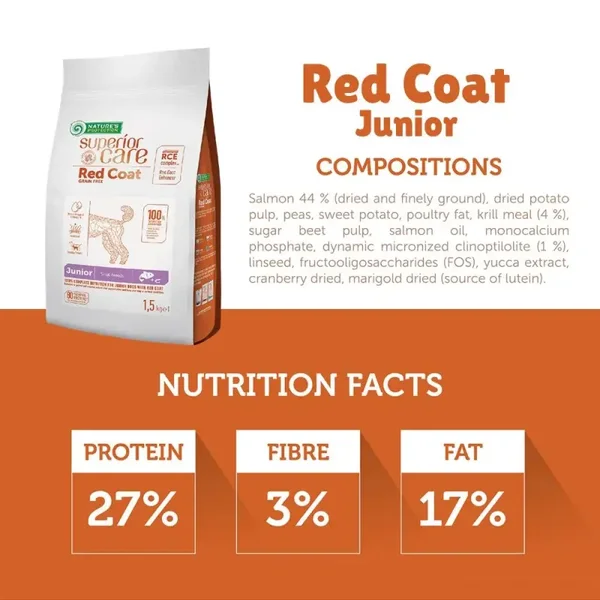 Nature’s Protection Red Coat Grain Free with Salmon for Junior Small Breed dogs is well known for its RCE Complex (Red Coat Enhancer Balanced Amino Acid Complex), a balanced composition that helps protect and enhance the natural pigmentation of the brown and red coats and maintain the clear tiers and saliva composition. The main source of protein in this dry dog food is Salmon. It is a high quality protein that is an excellent source of nutrition for dogs, as it is packed with essential nutrients that can help promote good health. It also contains an Antarctic krill, a unique and 100% sustainable source of Omega-3 and choline, which improves skin and coat condition, supports brain activity. The complete and balanced composition of this dry dog food is enriched with clinoptilolite of volcanic origin from nature – MicroZeoGen. It helps to remove toxins from the pet’s body and when it is detoxified the efficient nutrients, vitamins, and minerals easily absorb into the body. The composition is enriched with Omega-3 and Omega-6 fatty acids essential for healthy skin and coat conditions. As well Microalgae are an excellent source of iron, which promotes the good development of the brain and a strong immune system. Carefully selected ingredients provide your pet’s brain with the ingredients it needs from the first months of a puppy’s growth.